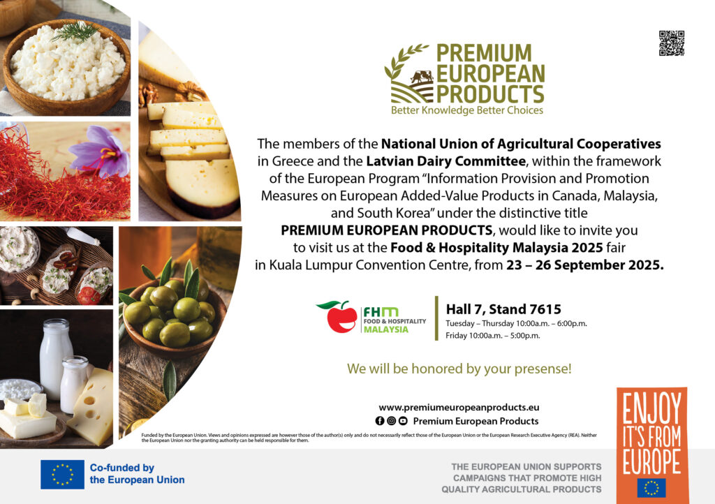 Ahli Kesatuan Koperasi Pertanian Nasional di Greece dan Jawatankuasa Tenusu Latvia, dalam rangka Program Eropah “Langkah Penyediaan Maklumat mengenai Produk Nilai Tambah Eropah di Kanada, Malaysia dan Korea Selatan” di bawah tajuk khas PREMIUM EUROPEAN PRODUCTS, ingin menjemput anda untuk melawat kami di pameran Makanan & Hospitaliti Malaysia di Pusat Konvensyen Kuala Lumpur, dari 23 – 26 September 2025. Kunjungi kami di